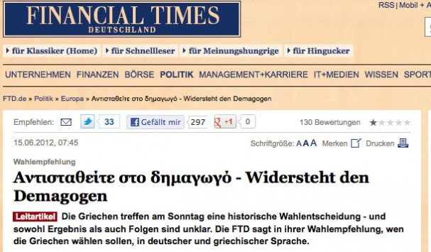 «Σύσταση προς τους ψηφοφόρους - Η Financial Times Deutschland (FTD) και η πλειοψηφία των Ελλήνων έχουν ένα κοινό συμφέρον: Η χώρα σας πρέπει να παραμείνει στο ευρώ. Την Κυριακή γίνονται ιστορικές εκλογές, οι οποίες θα είναι καθοριστικές ακριβώς επ’ αυτού, αλλά και για το μέλλον της Ευρωπαϊκής Νομισματικής Ένωσης. Γι’ αυτό η FTD κάνει σήμερα κατ’ εξαίρεση μία σύσταση στους Έλληνες ψηφοφόρους, κάτι που συνηθίζει πριν τις εκλογές για το Ομοσπονδιακό Κοινοβούλιο και για το Ευρωκοινοβούλιο. Αγαπητές Ελληνίδες, αγαπητοί Έλληνες, φροντίστε για ξεκάθαρες πολιτικές συνθήκες. Ψηφίστε θαρραλέα υπέρ της μεταρρυθμιστικής πορείας και όχι οργισμένα κατά της αναγκαίας και επίπονης αναδιάρθρωσης. Μόνο με τα κόμματα που αποδέχονται τους όρους των διεθνών χρηματοδοτών, η χώρα σας θα μπορέσει να παραμείνει στο ευρώ.